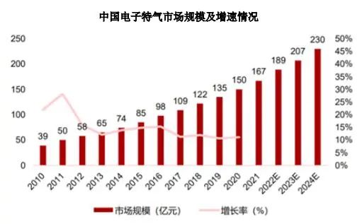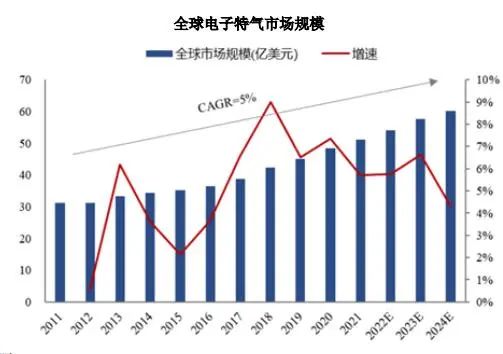 中國特種(zhǒng)氣體市場增速明顯高(gāo)於全球平均,市場潛力大。近年來,全球(qiú)半導(dǎo)體、顯(xiǎn)示麵板產業逐步向國內轉(zhuǎn)移,打造“中國芯”、實現進(jìn)口替代的緊迫性、 重要性不斷加強,半導體集成電路方麵的自主研發及產業化將得到大力推動,集成電路、顯(xiǎn)示麵板產業的發展將形成對電子特種氣體材料需求的有效帶(dài)動。根(gēn)據前瞻產業研究院數據,中(zhōng)國(guó)電子特氣 2020 年市場規模為 150億元,占全球比例約為 48%,預計 2024年我國電子特氣市(shì)場規模將達到 230 億元,全球占(zhàn)比將提高至 60%,2020-2024 年複合增速將達 11.28%。