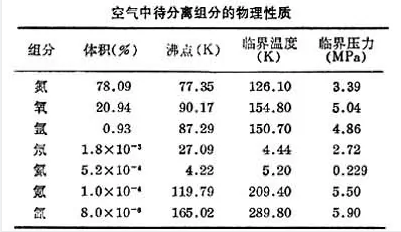 空分,利用空氣中各組分物理(lǐ)性質不同(見表),采用深度冷凍、吸附、膜分離等(děng)方法從空(kōng)氣(qì)中分離出氧氣、氮氣,或同時(shí)提取氦氣、氬氣等稀有氣(qì)體的過程。