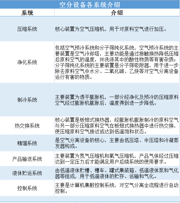 空分設備主(zhǔ)要由八大(dà)係統構(gòu)成,分別為壓縮係統、淨化係統、製冷係統、熱交換係統、精餾係統(tǒng)、產品輸送係(xì)統、液體貯存係統和控製係統。