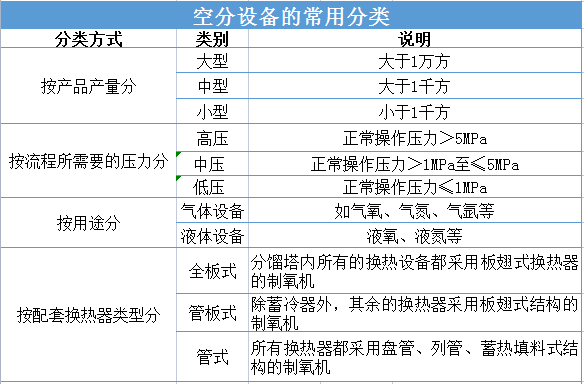 空分設備的分類方式較為多樣,可依據產能分為大中小型,也可(kě)根據流程所需(xū)要(yào)的壓力、使用用途和配套換熱器(qì)類(lèi)型進行分類。