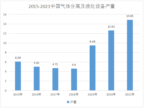 從供給端來看,2015至2018年,我國氣體分離(lí)及液化(huà)設備的(de)產量(liàng)從6.09萬台下降至4.6萬台,2019年開(kāi)始產量迅速增長,中國通用機械工業協會數據,2021年中國(guó)氣(qì)體分(fèn)離及液化設備產量增至14.85萬台,同比增長17.67%。