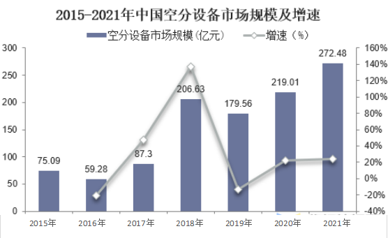 國內空分設備行業經曆了多年發展,已處於成熟(shú)的(de)發展階段。近年來我國空分設備市場規模(mó)快速增長,2021年中國空分設(shè)備(bèi)市場規模達272.48億元,同比增長24.4%。