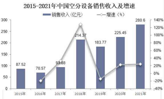 氣體分離設備及其生產的氣體產品應用廣泛,包括能源、冶金、電子、化工(煤化工、煉化一體化)、環保、航天航空、科學研究、保健、食品等領域。數(shù)據顯示,2021年我國空分(fèn)設(shè)備銷售收入(rù)達到280.6億元,同比增長24.5%。