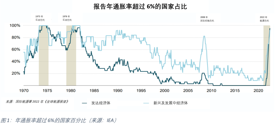 圖 1 顯示(shì)了自1970年以來報告的年通脹率超過6%的(de)國(guó)家百分比。從圖表(biǎo)中可以看(kàn)出,無論是發展中國家還是發達國家,報告通貨膨脹的國家(jiā)比例於2022年(nián)接近100%,通脹如今已是影響大多數國家的全(quán)球現象。