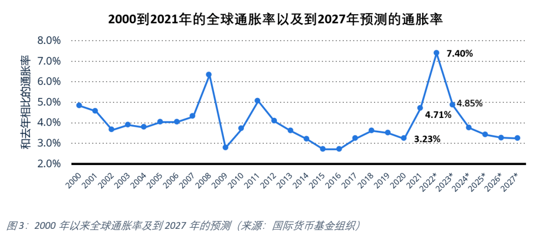 圖3中表明,盡管疫情對經濟產生了影響(xiǎng),但全球通脹率在疫情大流行的第一年降至3.23%,然後在2021年上升至4.7%。俄烏衝(chōng)突後,國際貨幣基金組織預計2022年全球通脹(zhàng)率將達到7.4%。這是自1996 [1] 年以來(lái)通脹率最高(gāo)的年度增(zēng)幅。此外,國際貨幣基金組織估計,到2024年,通脹率將持續高位,全球平均通脹率接近5%,2024年之後(hòu)降至較低水(shuǐ)平(píng)。