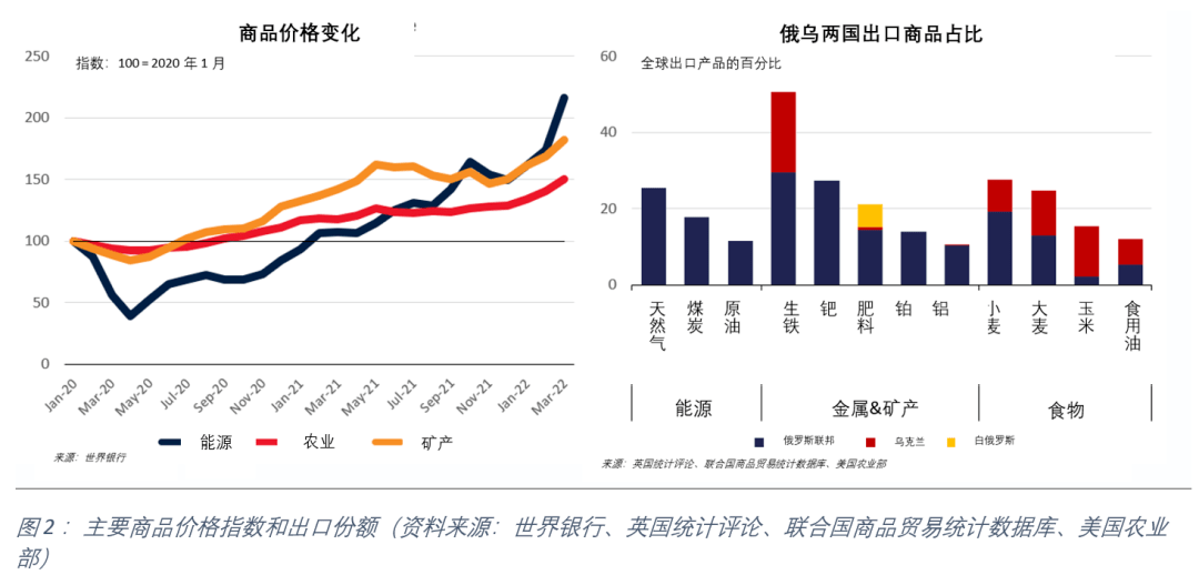自2020年以來,全球通脹的主要驅動因素是能源、農業(yè)和(hé)金屬商品價格的快速上漲。疫情給這些商品的全球供應鏈帶來了壓力;而2022年爆發(fā)的(de)俄烏衝突將價格推至更高的水平。圖2的左側(cè)圖表(biǎo)顯示(shì)了俄羅斯和烏克蘭在能(néng)源、金屬/礦物和農產品的商(shāng)品(pǐn)出口份額。此外,由於俄羅斯和烏克蘭出口的(de)這些(xiē)關鍵商品占較多的市場份額,盡管進口國努力填補這些空缺,但完全解(jiě)決全球供應鏈限製問題還需要時間。因(yīn)此,這意味著國際經濟中涉及通(tōng)脹的問題依舊存在。