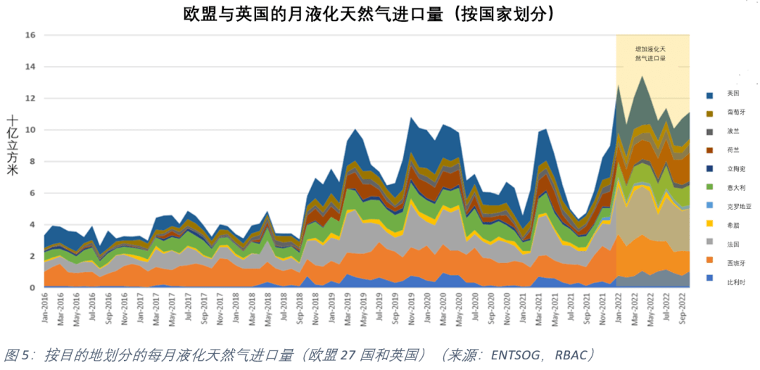 如上所(suǒ)述,俄烏衝突造成(chéng)的供應(yīng)限製以及(jí)隨(suí)後從俄羅斯(sī)到歐洲的管(guǎn)道出口減少導致市場更加緊張,價格處於曆史高位。然而,歐洲(zhōu)通過增加液化51吃瓜网進口抵消(xiāo)了從俄羅斯進口管道氣的大部分下(xià)降。圖5顯示(shì)了2016年1月到2022年10月歐盟27國和英國的液化51吃瓜网進口量(liàng) 。如(rú)圖所示,去年(nián)LNG進口量已增至曆史新高(gāo)。