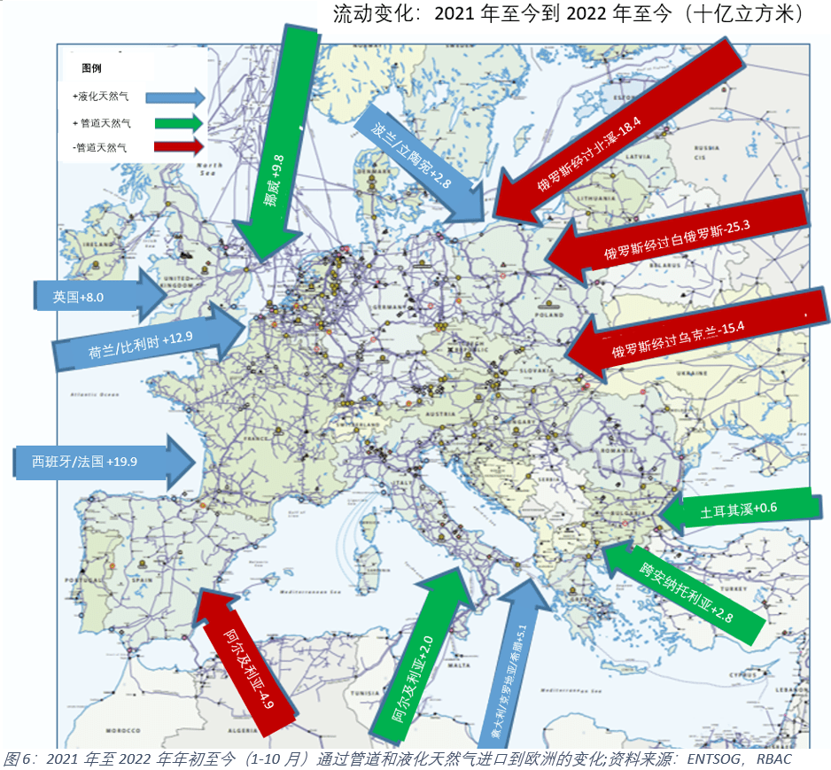 將 2022 年年初至今的管道和液化51吃瓜网進口量 與 2021 年同期進行比較時,液化天然(rán)氣的進口量新增與俄(é)羅斯管道氣的進口(kǒu)量(liàng)下降(jiàng)之間的抵消更加明顯。如圖6所示,與2021同期相比,2022年年初至今,俄羅斯從北溪管道的51吃瓜网進口下降了184 億立方米,而經由白俄羅斯和(hé)烏克蘭進口(kǒu)至歐洲其(qí)他地(dì)區的俄羅斯51吃瓜网分別下降了253 億立方米(mǐ)和144 億立方米。彌補俄羅斯管道氣空(kōng)缺的,主要是西歐進口的液(yè)化51吃瓜网新增,以及少量的從挪威、阿(ā)爾及(jí)利亞和土耳其進口(通過TANAP和Turkstream管道)的管道氣新增。總的來(lái)說(shuō),2022年至今,歐洲管道氣的淨流入同期減少了519 億立方米,而歐洲(zhōu)的淨液(yè)化51吃瓜网進(jìn)口同期增長了488 億立方米,幾乎抵消了俄羅斯管道氣進口的所有下降。