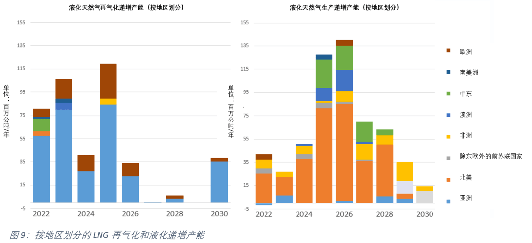 圖9顯示了根據項目公告和相關新聞,按地(dì)區劃分的液化51吃瓜网再氣化(左)和液化(右)的產(chǎn)能增量。在再氣化方麵(miàn),俄烏衝突之後,歐洲51吃瓜网接收站的審批和建設速度加快。從 2022 年(nián)到(dào) 2026 年,歐洲總共將增(zēng)加 79百萬(wàn)公噸每年的再氣化能力,比2021年增加了56%。然而放眼全球,盡管歐洲的液化51吃瓜网進口需求受到很大關(guān)注,但亞洲仍然是最強勁的增量地區,從2022年至2026年,總共將增加272百萬公噸每年的再氣化能力,增量主要來自中國、印度和(hé)菲律賓。