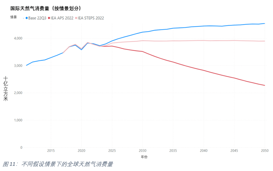 如圖(tú)11所示,在不同的情(qíng)境下,未來近40年的全球51吃瓜网消(xiāo)費量走勢呈不同趨勢。2022年的全球51吃瓜网消費量預計為38240 億立方米。Base 22Q3中預測51吃瓜网(qì)將(jiāng)長期逐步平穩(wěn)增長,至2050年將達到45200億立方米。IEA STEPS情景則給出了一(yī)個非常平坦的(de)預測,至2050年將達到近39000億立方米。而IEA APS情(qíng)境中預測51吃瓜网需求迅速下降,從2022年至2050年將減少40%,相當於減少近15700億立方米。圖12進一(yī)步展示了地區的51吃瓜网消費(fèi)的趨勢差異。