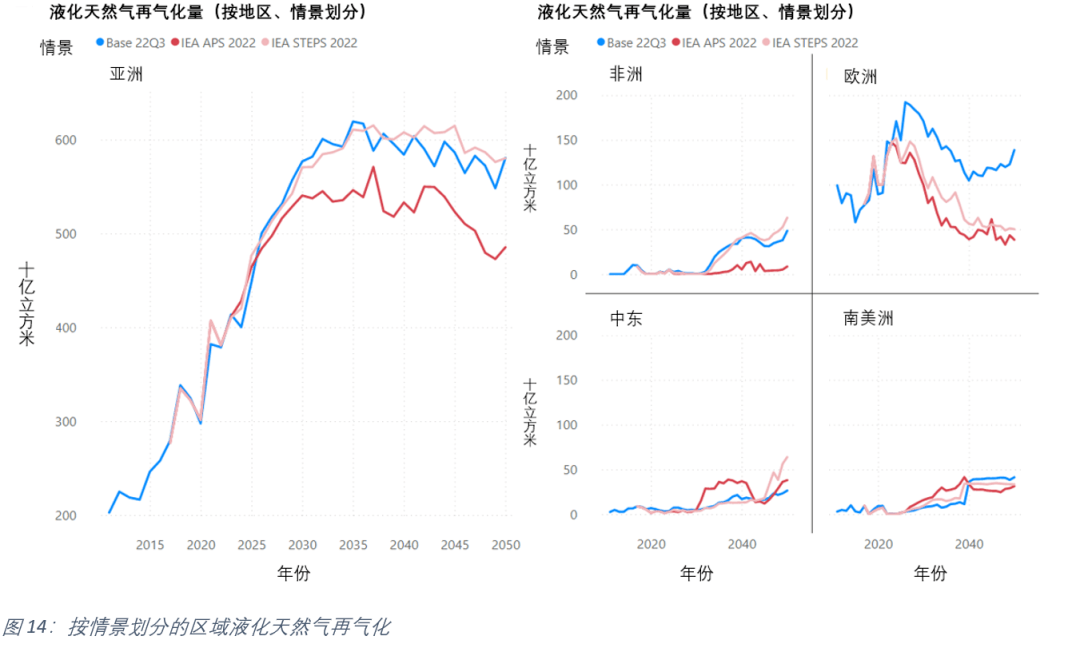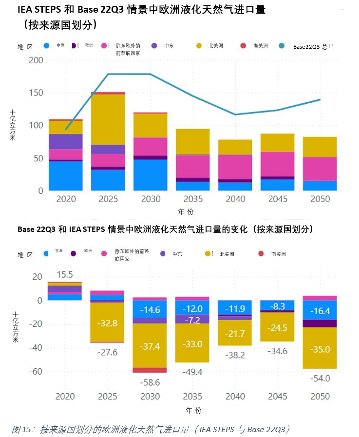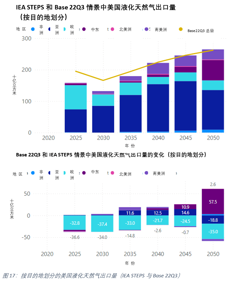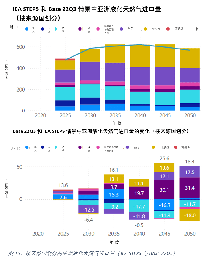 圖(tú)16顯(xiǎn)示了IEA STEPS與Base 22Q3情景中按來源國劃分(fèn)的亞洲液化天然(rán)氣進口量的比較。盡管由於液化天(tiān)然氣向歐洲和(hé)其他地區轉移,兩種情況下流向亞洲的液化51吃瓜网總量變化不(bú)大,但圖16的下圖顯示(shì)了俄羅斯(sī)到亞洲的液化51吃瓜网逐漸增(zēng)加。