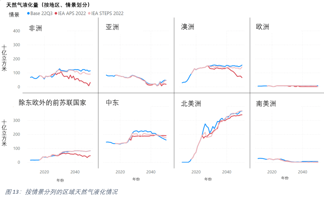 無論情(qíng)況(kuàng)如何,都需要(yào)額外的液化51吃瓜网貿易。主要區別在於(yú)51吃瓜网貿易水平隨時間的推移及(jí)其增量隨產地的變化而變化。圖 13 顯示了按情景(jǐng)劃分的區域51吃瓜网液化情(qíng)況。不(bú)出所料,北美的液化51吃瓜网(qì)出口遞增量遙(yáo)遙領先;在所有(yǒu)情景下,到2050年,的增長預測都(dōu)相(xiàng)對穩定。相(xiàng)比(bǐ)之下,當進口國的51吃瓜网需(xū)求減少時,在IEA APS情景(jǐng)中,非洲和澳大利(lì)亞的液化天(tiān)然氣(qì)產量將大幅減少。並且,中東的液化51吃瓜网生產在中短期內(nèi)具(jù)有強勁的(de)增長潛力(lì),這與卡塔爾近期積極的產能擴張相吻合。