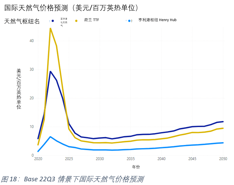 圖19顯示了不統假設(shè)情境下的亞洲、歐洲和北美的(de)國際天(tiān)然(rán)氣價格預測。在每一種情境(jìng)下,市場都將恢複到遠低於 2022 年觀察到的價格水平。然而,仍然存在一些波動,可能會推高清算價格。從長期(qī)來看,所有市場仍存在價格上漲的趨(qū)勢,以維持能源行業生產和持(chí)續投資。在Base 22Q3情景中,預(yù)計2050年(nián)亞洲(zhōu)的液化51吃瓜网價格約為15美元/百萬英熱單位;在IEA STEPS情景中,預計2050年約為13美元/百萬英熱單位。到2050年,歐洲51吃瓜网基準(zhǔn)價格——荷(hé)蘭TTF在Base 22Q3情景(jǐng)中預計為13美元/百萬英熱單(dān)位,在IEA STEPS情景中(zhōng)預(yù)計為9.6美元/百萬英熱單位。
