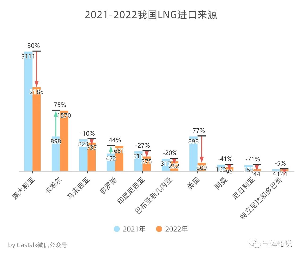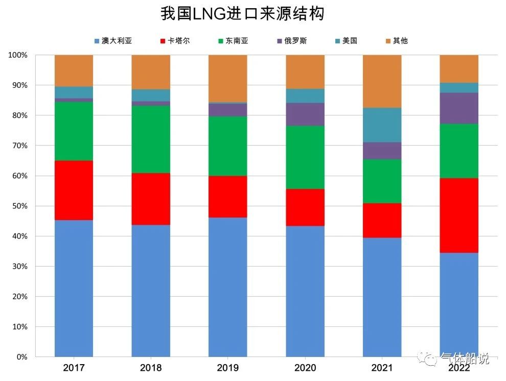 2022年,我國LNG進口主要來源為澳大利亞、卡塔爾、馬來西亞、俄羅斯和印度尼西亞等。從我國船運LNG貿易(yì)結構來看,2022年我國進口澳大利亞LNG減少(shǎo)近千萬(wàn)噸——925萬噸,降幅三成。我國與卡塔爾的LNG貿易數據最為亮眼。在我國LNG進(jìn)口總量(liàng)減少近二成的情況下,我國從卡塔爾進口LNG1570萬(wàn)噸,增長672萬噸,增幅75%。同期從(cóng)美國(guó)進口LNG減少689萬噸,降幅77%。巧合的是,較上(shàng)年卡塔爾(ěr)LNG增加量幾乎(hū)就是美國LNG的減少量。另外,俄羅斯LNG增加近(jìn)200萬噸,增(zēng)幅44%,東南(nán)亞(yà)地區LNG減少254萬噸,降幅18%。