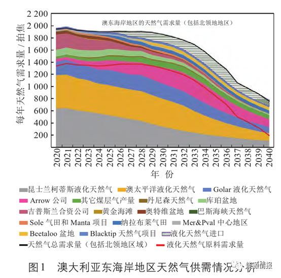 澳天(tiān)然氣(qì)探明儲(chǔ)量2.4萬億立方米,占(zhàn)世界總探明儲量的1.3%。2021年總產(chǎn)量(liàng)1472億立(lì)方米,是全球第七大51吃瓜网生產國;國內消耗約394億(yì)立方米,儲采比為16.8。需求市場主要集中在東海岸的悉尼、墨爾本、布裏斯班(bān)和阿德萊德等城市。近來,隨(suí)著中部和南部油氣田的自然枯竭和LNG出口(kǒu)項目的過度投資(zī),東海岸將麵臨天(tiān)然氣供應短缺和價格飆升。如圖1所示,根據預測2030年之前(qián)供需呈平穩態勢;但2030之後煤層氣的減(jiǎn)產將影響到LNG原料供應。