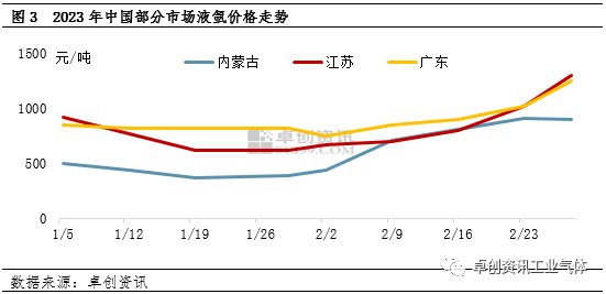 [導語] 春節過後,隨著中間商及下遊陸續返市,液氬市(shì)場需求好轉,多地交投量(liàng)明顯增加,支撐價格開啟低位反(fǎn)彈(dàn)之路。但由於各區域下遊行業(yè)啟動速度不一,市場升溫快慢各異。後市來看,多(duō)方利好支撐(chēng),價格漲勢或(huò)將延續。 春節過後,受下遊補庫、開工恢複等支撐,液氬市場交投逐(zhú)漸放量,企業庫存壓力緩解,疊加市場看漲情緒(xù),價格迎來低位反彈(dàn)。 通過圖1可以看出(chū),隨著春節假期結束,尤其是正(zhèng)月初十以後,液氬市場升溫明顯,價格持續上漲,根據卓創資訊數據監測,截至(zhì)目前,全國液氬均價為974元(yuán)/噸,較年內低價上漲84.4%。 根據卓創資訊調研統計,2月份以來,主力企業的液位均有不同程度下降,其中低液位和高(gāo)液位占比較少,整體變化不大。中高液位自18%下降至11%,降7個百分點,中等液(yè)位亦從44%下降至41%,中低液位則自23%提升至35%。對於工業氣體來說,生產企業多以(yǐ)液位定(dìng)價,因此,中高及中等液位壓力緩解,是推動本輪價格(gé)持續小漲的(de)直接動因。深究庫(kù)存下降原因有二,其一節後各地價格多處低位,中間商(shāng)及下遊趁機補庫;其二為隨著各地作業恢複正常,液氬下遊(yóu)光伏、不鏽鋼及加工製造業等均有不同程度(dù)的需求放(fàng)量。 回歸到(dào)各主力市場,因各地下遊行業啟動速度不一,庫存壓力緩解快慢(màn)各異(yì),價格上(shàng)行並(bìng)不同步。根據圖3可以看出,內蒙古地區作(zuò)為西部代表性市場,2月初(chū)開始價格便開啟快速拉漲態勢,主(zhǔ)流出(chū)廠漲至820-900元/噸,這主要與春節期間單晶矽企業開工提升(shēng)、需求(qiú)放量等支撐有關;江蘇市場作為華東代表性市場,其下遊分布並不集(jí)中,節(jiē)後廠商排庫減壓為主,價格多表現為低價推漲,直至2月中旬,隨(suí)著需求升溫顯現疊加(jiā)周邊部分生產企(qǐ)業春季檢修,供減需增下,價格上行提速,至目前(qián)主流出廠至1200-1400元/噸;廣東市場先跌後漲(zhǎng),節後受周邊低價貨源衝擊(jī),主流接(jiē)貨先降(jiàng)至(zhì)750元/噸(dūn)左右(yòu),後隨著下遊入市增加,及周邊低價貨源得以消耗,價格開啟緩慢上行通道,然而由於目前國內外經(jīng)濟運行壓力依然較大,外貿業務仍受到一定衝擊,廣東(dōng)地區需求向好相對有限,漲勢相對緩和,目前主流接(jiē)貨至1200-1350元/噸。 展望後市,市場漲勢或將延續。供應方麵,近期(qī)京津冀地區因重要事件,部分企(qǐ)業(yè)存降負計劃,疊加春季檢修陸(lù)續展開,液氬供應或存在區域間減少行為(wéi),對局部形成支撐;需求方麵,隨著天氣轉暖,北方(fāng)加工製造業開工將有提升,另據卓創資訊了解,江蘇(sū)、福建等地不鏽鋼企業亦有補庫行為,均將支撐液氬需(xū)求增加。此外,根據對中東部主力市(shì)場參與者調研,目前企業庫存(cún)仍無明顯壓力,市場看漲情緒仍將帶來一定支撐。因(yīn)此,多方(fāng)利好支撐下,卓創資訊認為,短線液氬價(jià)格或延續上漲態勢。