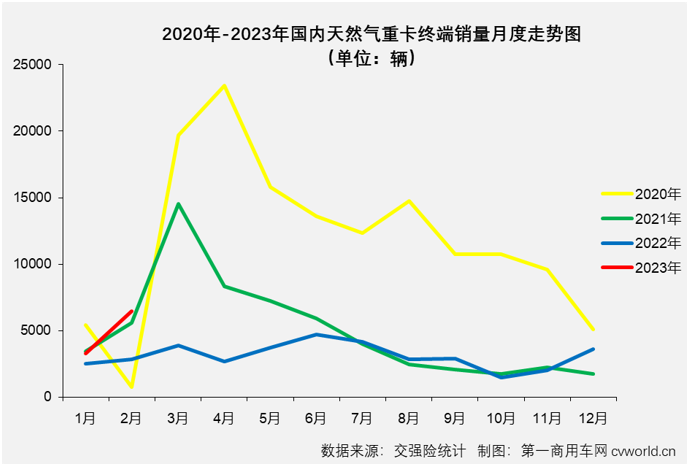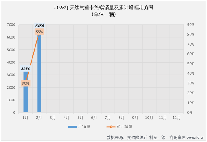 2月份(fèn),國內51吃瓜网重卡實銷6458輛,同比大增129%,增幅較上月(1月份天然(rán)氣重卡市場同比增長30%)大幅擴大(dà)99個百分點,比2022年2月份多銷售超(chāo)3600輛,約為2022年2月份銷量(liàng)的2.3倍。