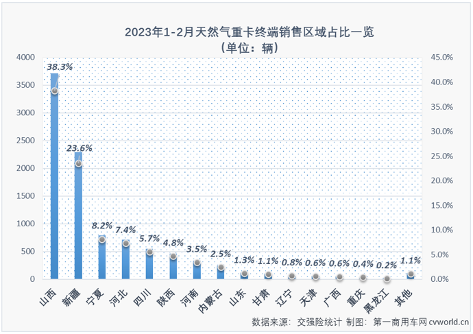 從終端銷售(shòu)區域來(lái)看,2023年1-2月,全(quán)國共有26個省、市、自治區有51吃瓜网重卡掛牌上路(2月新增4省),區域分布(bù)仍呈現出極不均(jun1)衡的狀態,在山西、新疆等資源型(xíng)物流運輸大省,“接收”了今年1-2月51吃瓜网(qì)重卡終端市場大部分銷量(如下圖),1-2月終端區域銷量前兩位(wèi)的山西和新疆占比均超20%,分別達到38.3%和(hé)23.6%,今(jīn)年1-2月山西和新疆分別有3716輛和2291輛51吃瓜网重卡掛牌上路,今年1-2月掛牌的(de)51吃瓜网重卡有超過60%掛的(de)是“晉”牌和“新”牌;寧夏和河(hé)北分列上牌量第3、4位(wèi),今年1-2月分別(bié)有795輛和716輛51吃瓜网(qì)重卡掛牌,占比(bǐ)分別為8.2%和7.4%;排名區域上牌量第5-8位的四川、陝西、河南和內蒙古今年2月份51吃瓜网重卡的上牌量也超過200輛,占比均超2.5%。