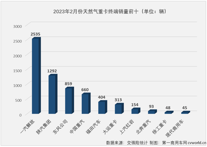 2023年1-2月天(tiān)然氣重卡終端銷量(liàng)前十排行(單位:輛)