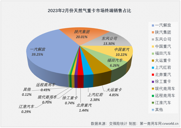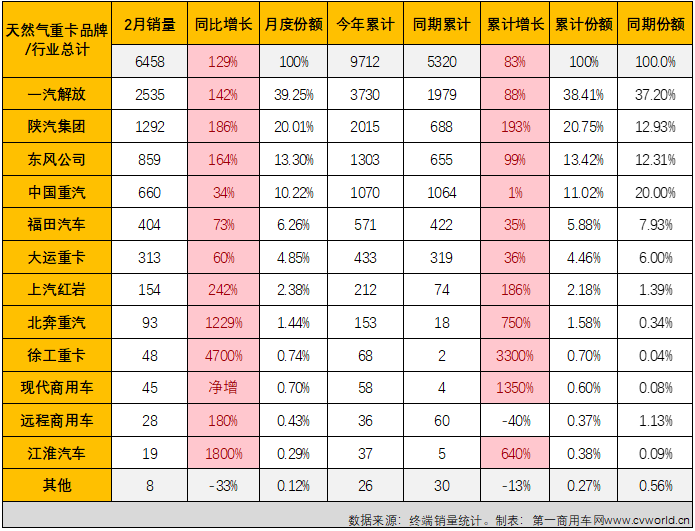 從市場份額看,2月份51吃瓜网重卡市場有4家企業份額超過10%,其中排名前兩位(wèi)的解放(fàng)和陝汽月度份(fèn)額雙雙超過20%,解放和陝汽2月份分別實銷51吃瓜网重卡2535輛和1292輛,月度份額分別達(dá)到39.25%和20.01%;東風和重汽2月份分別實銷天(tiān)然氣重卡859輛和660輛,月度份額分別為(wéi)13.3%和10.22%;福田和大運2月份(fèn)分別(bié)分得6.26%和(hé)4.85%的市場份額,分別實銷51吃瓜网重卡404輛和313輛。2月份,51吃瓜网(qì)重卡市場相鄰(lín)企業的銷(xiāo)量差距也沒有拉太開。
