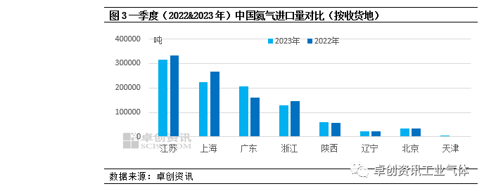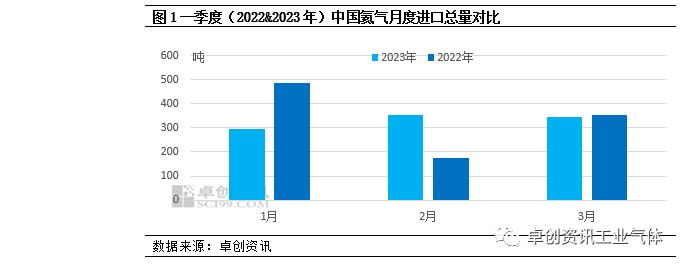據卓創資訊數據監測,2023年一季度氦氣進口量共995.793噸,較2022年一季(jì)度減少2.06%。從月度數據來看,整體呈(chéng)現先增後減的態(tài)勢。1月份進口量共295.669噸,受春節假期影響,需(xū)求(qiú)減少,進口量環(huán)比減少23.2%,當月進口均價(jià)為117.26美元/公斤;隨著需求恢複,2月進(jìn)口量(liàng)較1月增加19.93%至354.597噸,當月進口均價為148.73美(měi)元/公斤。3月進口氦氣量在345.527噸,較2月減少2.56%,雖(suī)有減少,但受需求升溫的帶動,進口量仍然保持高位。相比2022年先(xiān)減後增(zēng)的態勢,正好相反,同時(shí)從圖1中我們也可以看到(dào),3月份,受需求(qiú)帶動,兩年氦氣(qì)進口量逐步恢複到正常水平。