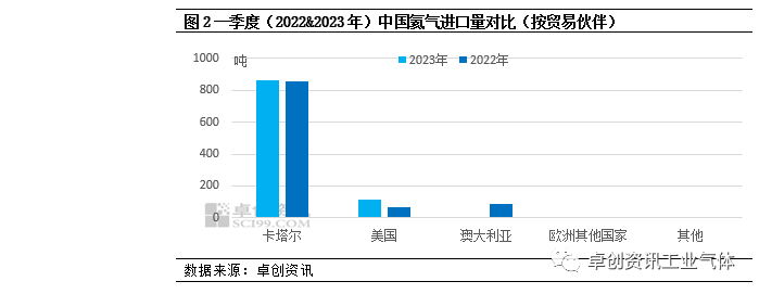 按貿易夥伴來看,一季度(2022&2023年)氦氣進口量(liàng)主要來自卡塔爾、美國、澳(ào)大利亞以及歐洲其他國家。2023年一季度(dù)卡塔爾進口量863.262噸,同比增長1.04%,占到一季度總進口量(liàng)的87%。2023年一季度美國進口量116.124噸,同比增長71.39%,一方麵(miàn)是3月份進口均價大幅回落帶動當月進口量增加,另(lìng)一方麵則是2022年1月份自美國進口量較少(shǎo)。2023年一季度澳大(dà)利(lì)亞無進(jìn)口量(liàng)。另外,2023年自歐洲其他國家進口量有所增(zēng)加,共進口9噸,較2022年增長154%。