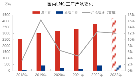 據隆眾資訊統計數據顯示,截止2022年底,國內LNG工廠年產能 3779萬噸。加上今年已經投產(chǎn)的,另外仍有(yǒu)1730萬(wàn)方/日的工廠(chǎng)產能預計在2023年投產,2023年底國內LNG工廠年產能有(yǒu)望增(zēng)至4234萬噸(dūn)。較2022年產能增加455萬噸,產能增速約12%。增產產能為(wéi)近六年之最,但隨著產能基數的逐年增加,增速穩中下滑。