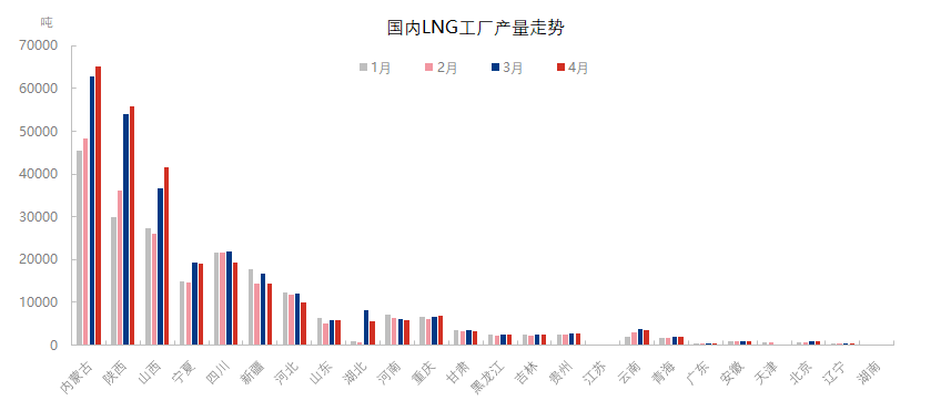 從LNG工廠產量走勢來看(kàn),華北、西北主(zhǔ)產(chǎn)地區的(de)產量當仁不讓的位於第一梯(tī)隊,並且在供暖季結束時有了極大提產(chǎn)。因為(wéi)供暖季結束,主產地管道氣氣源充足,LNG工廠開工率上漲。