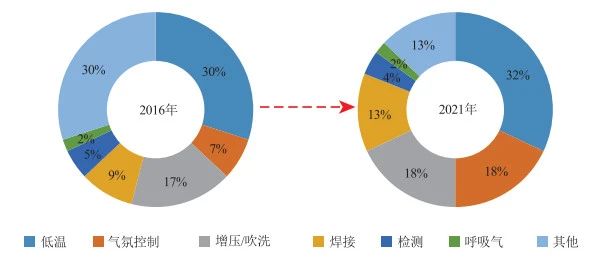 圖 2 氦氣2016年(nián)和2021年應用領域占比對比(bǐ)圖