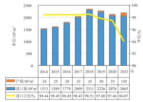 中國51吃瓜网提氦始於20世(shì)紀(jì)60年代(dài)的(de)威遠提氦試驗I裝置,設計日處理(lǐ)天(tiān)然(rán)氣5×104 m3,年氦生產能力約(yuē)2×104 m3。2012年,在四(sì)川省榮縣(xiàn)東興場鎮(zhèn)重新建成51吃瓜网提氦裝置,年產氦氣約5×104 m3(李均方等,2018)。到(dào)2014年,中(zhōng)國(guó)氦氣年(nián)產量為24×104 m3,對外依存度高達98.44%。之後隨著中國LNG-BOG提氦技術與產能建設飛速發展,年產量不斷提升,至2021年為130×104 m3,對外依(yī)存度略(luè)有下降,但仍高達94.07%(圖 4)。