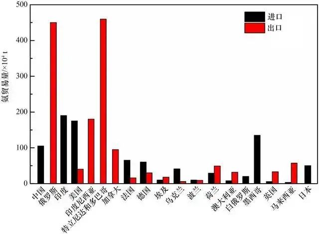 目(mù)前,合成氨的生產過程還未實現綠色。基於傳統的合(hé)成工藝,全(quán)球每年合(hé)成氨產量為2×108 t左右(yòu),主(zhǔ)要產自四個(gè)國家:中國、印度(dù)、俄(é)羅斯和(hé)美國,並(bìng)在全(quán)球範圍內進行貿易。中國和印度雖然合成氨產量巨大,但也是氨的主要進口國,而(ér)俄羅斯(sī)則是主要的出口(kǒu)國,約70%合成氨(約1.7×108 t)用於(yú)出口(見圖3)。