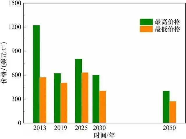 在可再生資源最(zuì)好的地區,綠氨的成(chéng)本估計(jì)為689 美元/t,高於灰氨(ān)的價格(gé)(225 美元/t)。據預測,到2030年綠氨價格將降至464 美元(yuán)/t,到2050年將降至295 美元/t(見圖6)。當碳價格為(wéi)127 美元/t左右時,綠氨就能與現有的化(huà)石合成氨生產相競爭。2030年後,綠氨預計將通過碳捕集實現與灰氨的合成成本持平,這(zhè)也讓用氨的下遊化工企業更有動力使用綠氨代替灰氨作為原材料(liào)。綠氨液化後的單位(wèi)體積能量密度雖然不(bú)及傳(chuán)統的化石能源,但高於綠氫。尤為重要的是綠氨的液化(huà)和運輸產生的成本遠低於綠氫(qīng)。從"製 ‒ 儲 ‒ 輸 ‒ 用"全生命周期成本來(lái)看,綠氨的(de)成本低於綠氫。由此可以預見(jiàn),未來綠氨會在能源(yuán)領域大量(liàng)使用,而化工領域也會同時實現綠氨對傳統合(hé)成氨工業的替代。目前全球多個大型綠氫綠(lǜ)氨項目正在推進,預測到2030年,全球宣(xuān)布(bù)的綠氨項目年生產能力為1.5×107 t(54個項目,產能是當前氨市場的8%),我國綠氨規劃並落地的年產能已超過1.56×106t。
