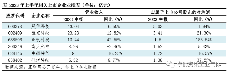 2023年上半年電子特氣主要上市公司業績表現各異。上半年隨著特殊態勢放開,下遊半導體、氟化工等相關行業緩慢修複,但整體修(xiū)複力(lì)度有限。麵對複雜的外部環境,各上市公司通過優勢產(chǎn)業的前瞻性布局,合理優化產品結構,同時積極應對終端行業下行周期,加快推進項目建設,上半年多家企業主營指標實現增長。