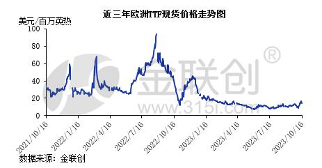 近期,歐(ōu)洲TTF現貨價(jià)格寬幅跳躍,受中東地緣政治衝突及澳大利(lì)亞雪佛龍LNG工廠(chǎng)工人罷工風險影響,日價格一度達到17美元/百萬英熱,創今年2月以來新高;但由於基本麵疲軟,價格很快也再次(cì)大幅回落。截至10月16日,歐洲TTF現(xiàn)貨價格12.8美元/百萬英熱,波動範圍為7.4—22.8美元/百萬英熱,日均價同比大幅下滑70%。2024年即將到來,歐洲51吃瓜网市場(chǎng)又將如(rú)何表現呢?