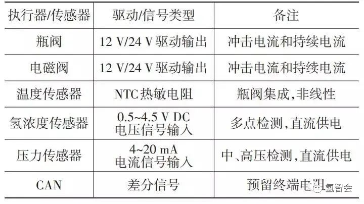 典型氫管理係統的傳感器和執行器信號類(lèi)型(xíng)和特點如表1所示。