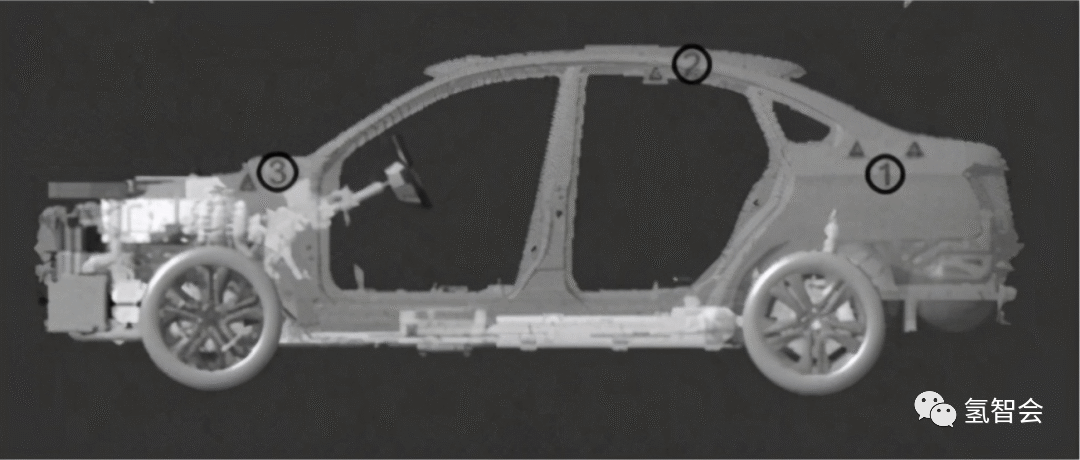 氫泄露傳感器(qì)的布置如圖3所示(shì),圖中傳感器布置在了後備箱的最高點①、乘客艙②和前機艙③附近,有的傳感器布置方案也在儲氫瓶口處(chù)增設氫傳感器。