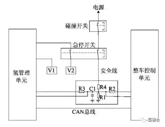 圖中的應急安全硬線裝置由碰撞開關、急停開關(guān)、氫係統控製器控製端和整(zhěng)車控製(zhì)控製端等四個端口同時控製,實際應用(yòng)中控製端(duān)口也可以按照相同的原理增加或減少。