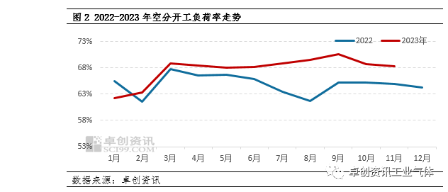 月內空分開工負荷持續小幅下滑。一方麵受淡季等因素影響,鋼(gāng)鐵利潤表現不佳,部分配套鋼廠空分開工負荷略有下(xià)降;另一方麵,受氧氮市場弱勢影響,部分地區(qū)全(quán)液化裝置降荷或停車。預計11月空分開工(gōng)負荷降至68.36%,環比(bǐ)上月下降0.41個百分點。液氬供(gòng)應(yīng)量或有所減少,但不(bú)足以對價格形(xíng)成提振。
