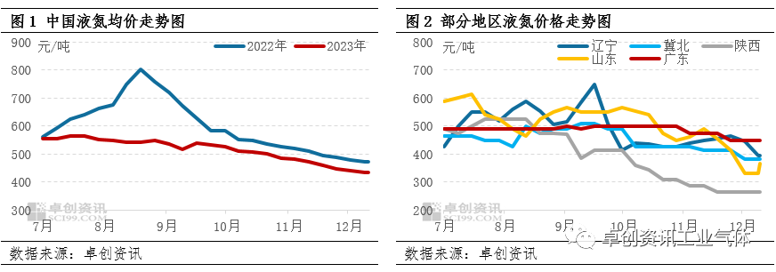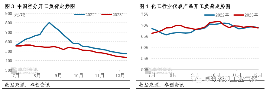 12月份以來,液氮市場需求進一步轉弱,疊加各地供應整體較足,液氮價(jià)格缺乏指引,月內走勢震蕩下跌為主(zhǔ)。據卓創資訊數(shù)據監測(cè),截至12月16日,中國液氮均價(jià)收於435.09元/噸,較上月(yuè)同期跌8.04%,較(jiào)去年同期跌(diē)7.76%。進入12月,液氮市場弱勢不改,多地價格探底。分區(qū)域來看,受寒冷天氣影響,北方地區戶外作業受限,下遊加工(gōng)製造等行業用氮量減少,東北(běi)、西北、華(huá)北液氮(dàn)市場氛圍轉弱,價(jià)格下跌為(wéi)主,僅新疆地(dì)區受本地(dì)供應不多、下(xià)遊多晶矽行業階段性需求增量帶動,價格稍高。中南部地區下遊相關行業表現一般,采購(gòu)維持剛需為主,液(yè)氮價格難尋支撐,亦呈下跌走勢(shì)。但隨著價格探底,山東、江(jiāng)蘇、廣東等地(dì)部分全液化裝置觸及成本線,停車數量陸續增多;另外浙江、四川等地主力企業有檢修、采購計劃,月下旬以來交投氛圍略有改善,山東、安徽(huī)、四川價格(gé)小幅回漲(zhǎng),全國均價跌勢放緩,隱有反彈跡象。據卓創資訊數據監測,截至12月16日,山東液氮主流價格至365元/噸,較上月同期跌25%,較(jiào)月內最低點漲11%;遼(liáo)寧液氮均價至(zhì)395元/噸,較上月同期跌12%。供需平(píng)淡,基本(běn)麵對液氮價格(gé)缺乏(fá)指(zhǐ)引淡季市場氧氮需(xū)求表現疲軟,市場出貨壓(yā)力凸(tū)顯,空分開工負荷率小幅下(xià)滑。據(jù)卓創資訊數據監測,截至12月14日,中國空分裝置開工負荷率至66.46%,較上月同期下滑1.23個百分點,較月初下滑1.73個百分點。需求麵,主要下遊化工行(háng)業(yè)表現一般,對液氮市場需(xū)求難有支撐,截至12月7日,卓創資訊監測的41個代表化工品平均開工負荷率至68.68%,較上月同期降(jiàng)0.78個百分點。整體來看,月中上旬液氮市場供(gòng)應雖微幅減少,但相(xiàng)較於需求弱勢,價格仍難有帶動(dòng)。月下旬開始,隨著華(huá)東地區全液化裝置停車數量增多,加之(zhī)個別企業檢修期間批量采購,華東液氮市場(chǎng)氛(fēn)圍稍有改善,價格出現小幅反彈。後市供應或呈遞減走勢,局部價格存觸(chù)底(dǐ)反彈可能後市來看,受淡季市場弱勢氛圍影響,部分地區氧氮價格探底後廠商成本麵壓力凸顯,配套空(kōng)分(fèn)裝置開工負荷或將維持主產品剛需為主,全液化、外掛液化裝置停車數量或逐漸增多,液氮市場整體供應壓(yā)力有望緩解;需求麵,進(jìn)入淡季終(zhōng)端需求難有改善,僅個別廠商裝置檢修期間存批量(liàng)采(cǎi)購需求。綜合來看,卓創資訊預計短(duǎn)線液氮市(shì)場窄幅波動(dòng)為主,個(gè)別(bié)低價或存小幅反彈空間。