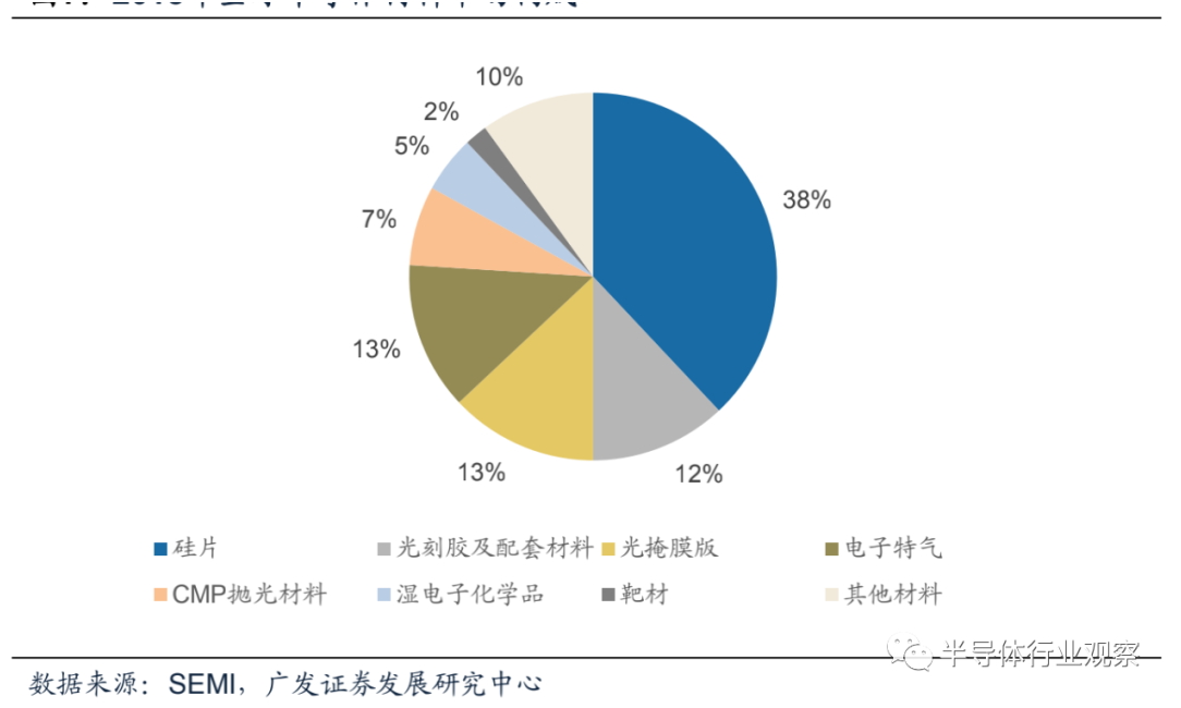 從半導(dǎo)體材料市場的具體(tǐ)構成來看,根據SEMI數據,大矽(guī)片占比高達38%,電子特氣與掩膜版均占比13%位(wèi)居次席(xí),其餘市場份額由光刻膠、靶材、CMP拋光材料等產(chǎn)品占據。