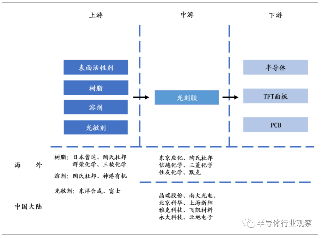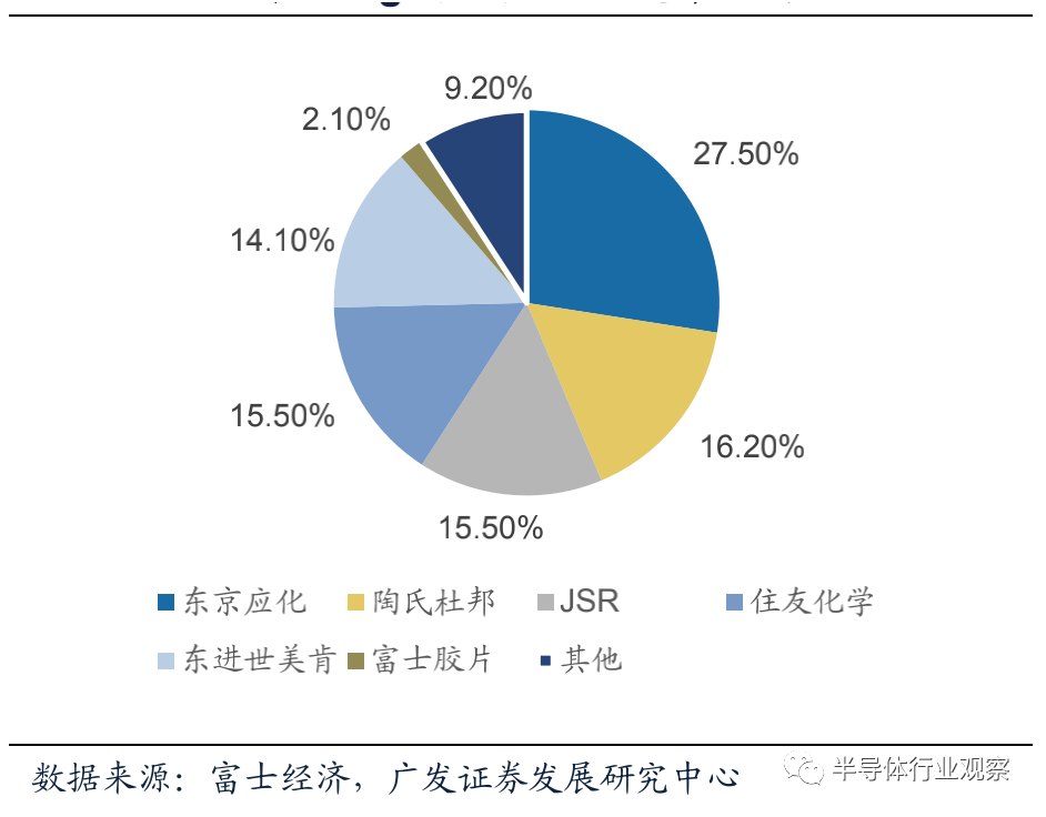 日本企業在半導體光刻膠(jiāo)領(lǐng)域占據絕對優勢(shì)。半導體光刻膠(jiāo)主要生產企業包(bāo)括日本東京應化、JSR、住友化學、信越(yuè)化學(xué);韓國東進世美肯;美國陶氏杜邦,其中(zhōng)日本(běn)企業占據約70%市場份額。分產品看,東京應化(huà)在g線/i線和Krf光刻膠領域居龍頭地位,市場份額分別達到27.5%和32.7%。JSR在Arf光刻膠領域市占率最(zuì)高,為25.6%。