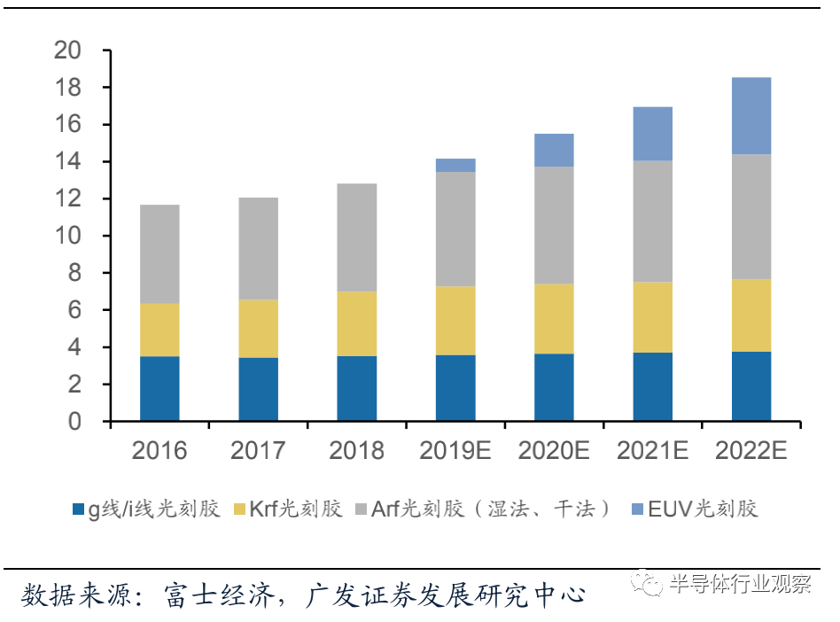 根據富士經濟數據,預計2022年ArF銷售(shòu)額將達6.74億美元,g線/i線光刻膠和KrF光刻膠銷售(shòu)額預計可達3.80億美元和3.88億美元。EUV、光刻技(jì)術(shù)目前尚未普及,僅台積電和三星掌握,EUV光刻膠市場規模較(jiào)小。