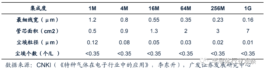 不同線寬下對(duì)應特氣所(suǒ)含顆粒雜質要求