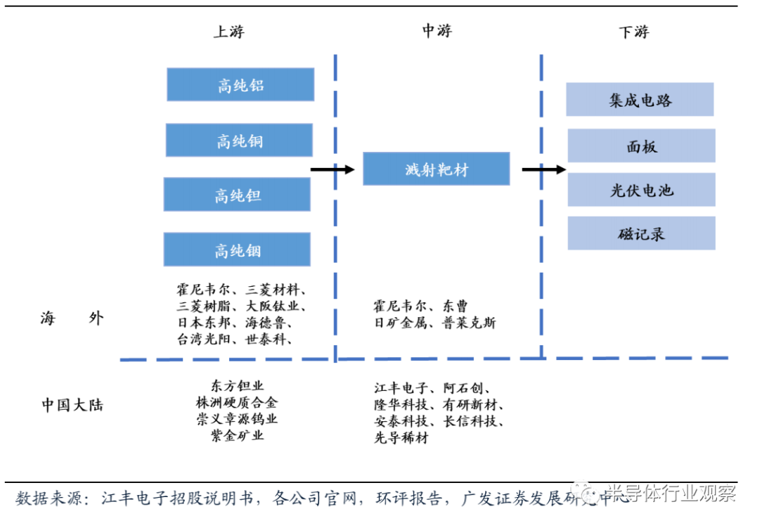 靶材上遊是各類高純金屬,主要由霍尼韋爾、三菱材料、世泰科等境外(wài)企業供應。國內方鉭業有一定高純鉭供應能力,2014-2016年躋身於江豐電(diàn)子(zǐ)前五大供應商。靶材下遊是集成電路、麵板、光伏電池和磁記錄行業,不同領域對靶材純度的要求不同,光伏和磁記錄(lù)要求靶材純度為4N(99.99%),麵板領域為5N(99.999%),集成(chéng)電路領域為5.5N和(hé)6N(99.9995%和99.9999%)
