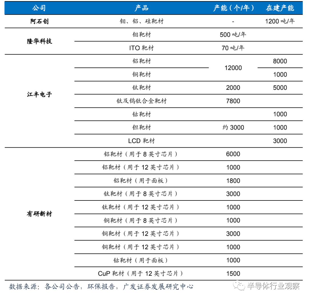 隆華科技:隆華科(kē)技通過收購(gòu)四豐電子切入鉬靶材領域,相關產品在麵板領域認可度較高,客戶包括三星、LG、京東方、華星光電等知(zhī)名公司;通過收購廣西晶聯切入ITO靶材行業,目前已實(shí)現G8.5代產品穩定供貨,首套G10.5產品於今年6月交付。公司目前總共(gòng)擁有鉬(mù)靶(bǎ)材(cái)產能500噸/年,ITO靶材產(chǎn)能70噸/年。
