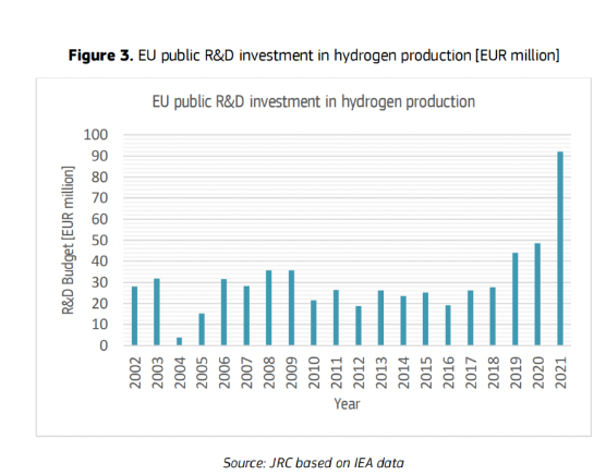 圖|歐盟對氫氣生產的公共研發投資[百(bǎi)萬歐元]
