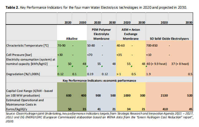 圖|2020年和2030年四種主要電解水技術的(de)性能指標(biāo)