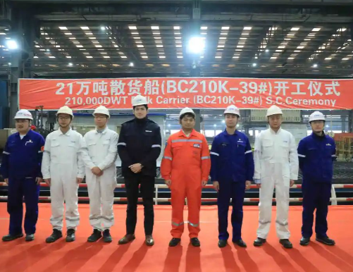 近日,中國船舶集團青島北海造船有限公司承建的日本商船三井21萬噸LNG雙燃料散貨船項目39號船在公司聯合廠房舉行開工儀式。該船為北海造船與MOL合作的係列船中(zhōng)首製船,也是(shì)北海造船繼韓國“H-Line”項目之後再次承建的雙燃料船型。作為北海造船自主研發的新一代“綠色環保”船型(xíng),憑借更好的(de)燃(rán)油/燃氣經(jīng)濟性及低排放等優勢,成功進入日韓主(zhǔ)流航運市場,實現了21萬噸LNG雙燃料散貨船的批量(liàng)化生(shēng)產,提高(gāo)了公司(sī)在新能源散貨船型市場的占有率(lǜ)和競爭力。(北海造(zào)船)