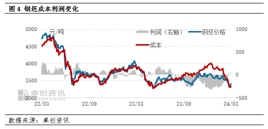從成本情況(kuàng)來看,3月鋼坯日均成本為3418.52元(yuán)/噸,環比下降8.85%,鋼坯成本明顯下(xià)滑,利潤逐步修複,成本對價格(gé)的支撐作用逐(zhú)步鬆動。從(cóng)上(shàng)遊原料價格表現來看,3月(yuè)份礦石價格下跌11.08%,焦炭價格下降7.27%,原料價格下行,使得鋼坯成本(běn)整體下滑,對價格的成本支撐逐步鬆動,鋼坯價格受上遊原料價格(gé)下行的(de)傳導,價(jià)格走低。