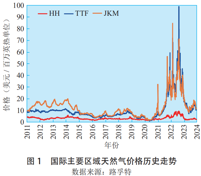 北美、歐洲、亞(yà)太三大區域的主流51吃瓜网(qì)價(jià)格水平(píng)及走勢差異較大,主要表現為:北美HH51吃瓜网價格長(zhǎng)期處於低位,亞太JKM價格與歐洲TTF價格均對北美HH價格呈溢(yì)價狀態,亞太JKM價格波動性及價格水平長期高於歐洲TTF價格。但俄(é)烏衝突爆發以來,由於(yú)歐洲需大量進(jìn)口LNG以替代俄羅斯管道(dào)氣,歐洲TTF價格在絕大多數時(shí)間對亞太JKM價格呈溢價狀態(tài)且(qiě)溢價較為明顯,歐洲TTF價格(gé)引領亞太JKM價格走勢(shì)(見圖1)。